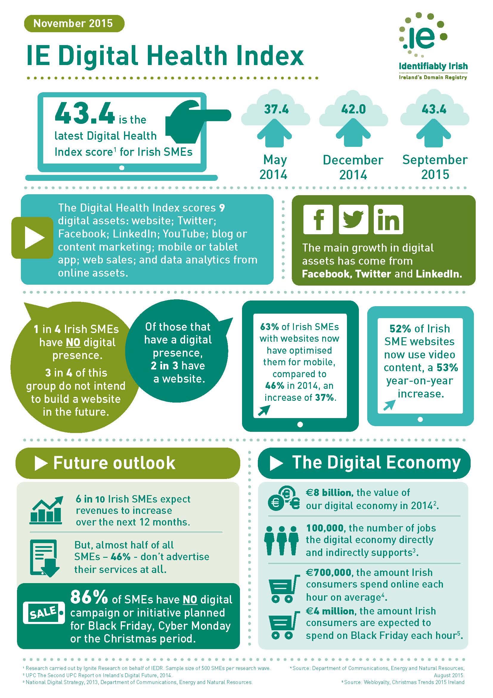 IEDR’s “IE Digital Health Index”, compiled in three waves of research in May 2014, December 2014 and September 2015, measures the health of Irish SMEs’ digital presence by analysing the number of digital assets (like websites, apps and social media accounts) owned by them, and their perceived quality. Its findings highlight an alarming number of SMEs lagging behind in the digital space.