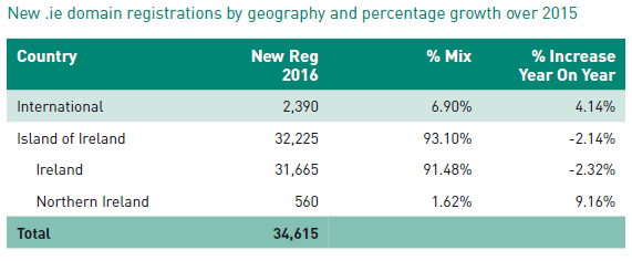 Looking at the geographical breakdown of the 34,615 .ie domains registered in 2016, 93% were registered on the island of Ireland. Of that number, 98% (31,665) were registered in the Republic of Ireland (a 2% decrease on 2015); and 2% (560) were registered in Northern Ireland (a 9% increase on 2015). 2,390 .ie domains were registered outside the island of Ireland in 2016, a 4% increase year-on-year.