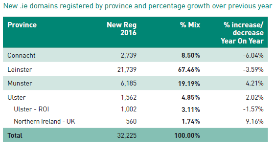 Breaking this down to a provincial level we see that Leinster accounted for 67% of all .ie domains registered in 2016 (21,739), a 4% decrease year-on-year. This was followed by Munster with 19% (6,185), a 4% increase on 2015; Connacht accounted for 8.5% of all new .ie domains (2,739, down 6%); Ulster accounted for 5% (1,562, up 2%).